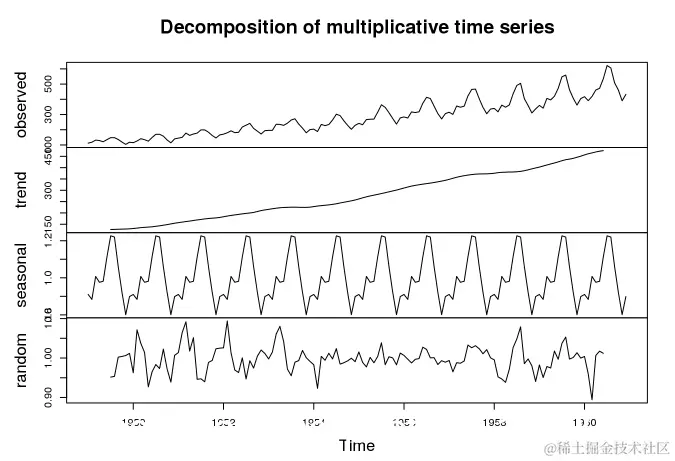 对于AirPassengers数据集,我们指定数据是乘法的并获得以下分解: