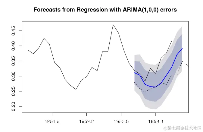 ARIMAX(1,0,0)模型的预测显示为蓝色,而ARIMA(1,0,0)(1,0,0)模型的预测显示为虚线。实际观察值显示为黑线。结果表明,ARIMAX(1,0,0)明显比ARIMA(1,0,0)(1,0,0)模型更准确。