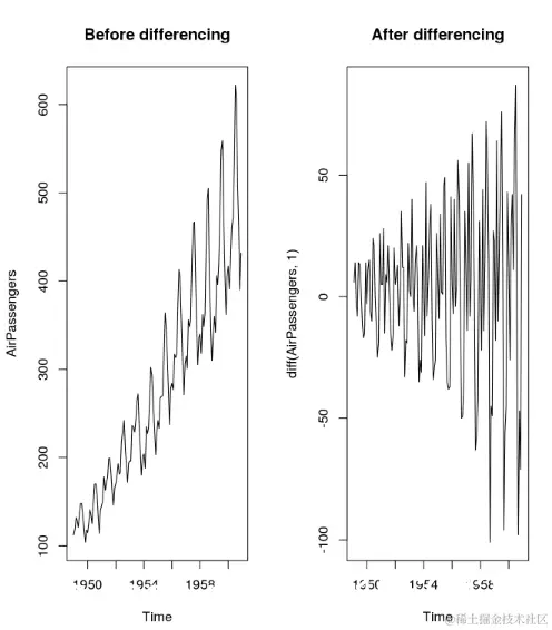 虽然第一个图表显示数据显然是非平稳的,但第二个图表明差分时间序列是相当平稳的。