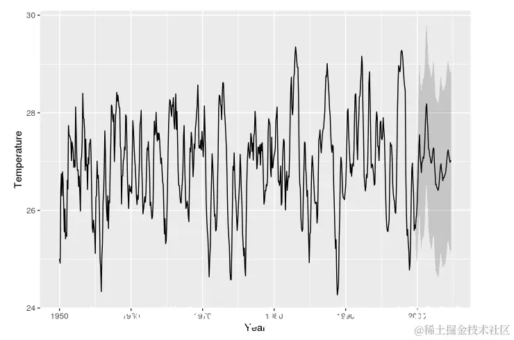 我们现在可以使用该模型来预测未来Nino 3.4地区的气温如何变化。有两种方法可以从预测模型中获得预测。第一种方法依赖于predict函数,而第二种方法使用包中的forecast函数。使用该predict功能,我们可以通过以下方式预测和可视化结果: