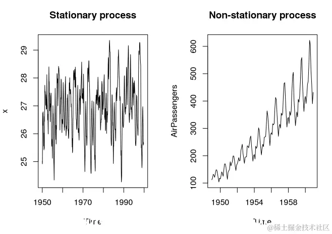 左图显示了一个平稳过程,其中数据在所有测量中表现相似。右图显示了一个非平稳过程,其中平均值随着时间的推移而增加。