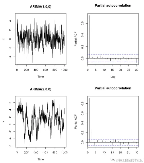 第一个例子表明,对于ARIMA(1,0,0)过程,阶数1的pACF非常高,而对于ARIMA(2,0,0)过程,阶数1和阶数2自相关都很重要。因此,可以根据pACF显着的最大滞后来选择AR项的阶数。