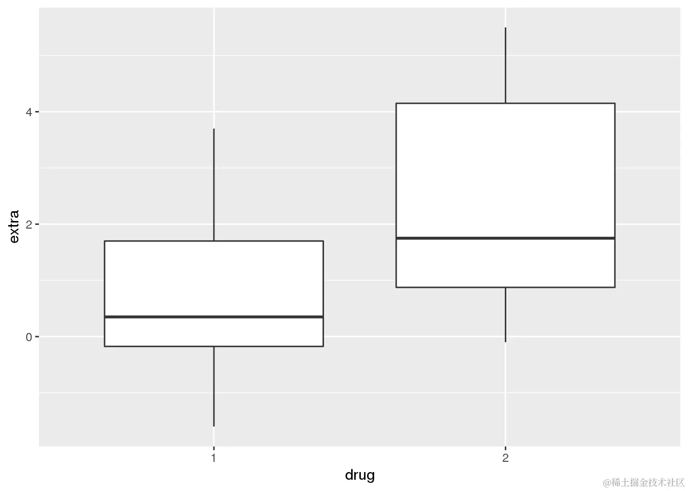 extra表示与基线测量相比睡眠中的增加/减少(正/负值),组表示药物,ID表示患者ID。为了更清楚,我将组重命名为药物: