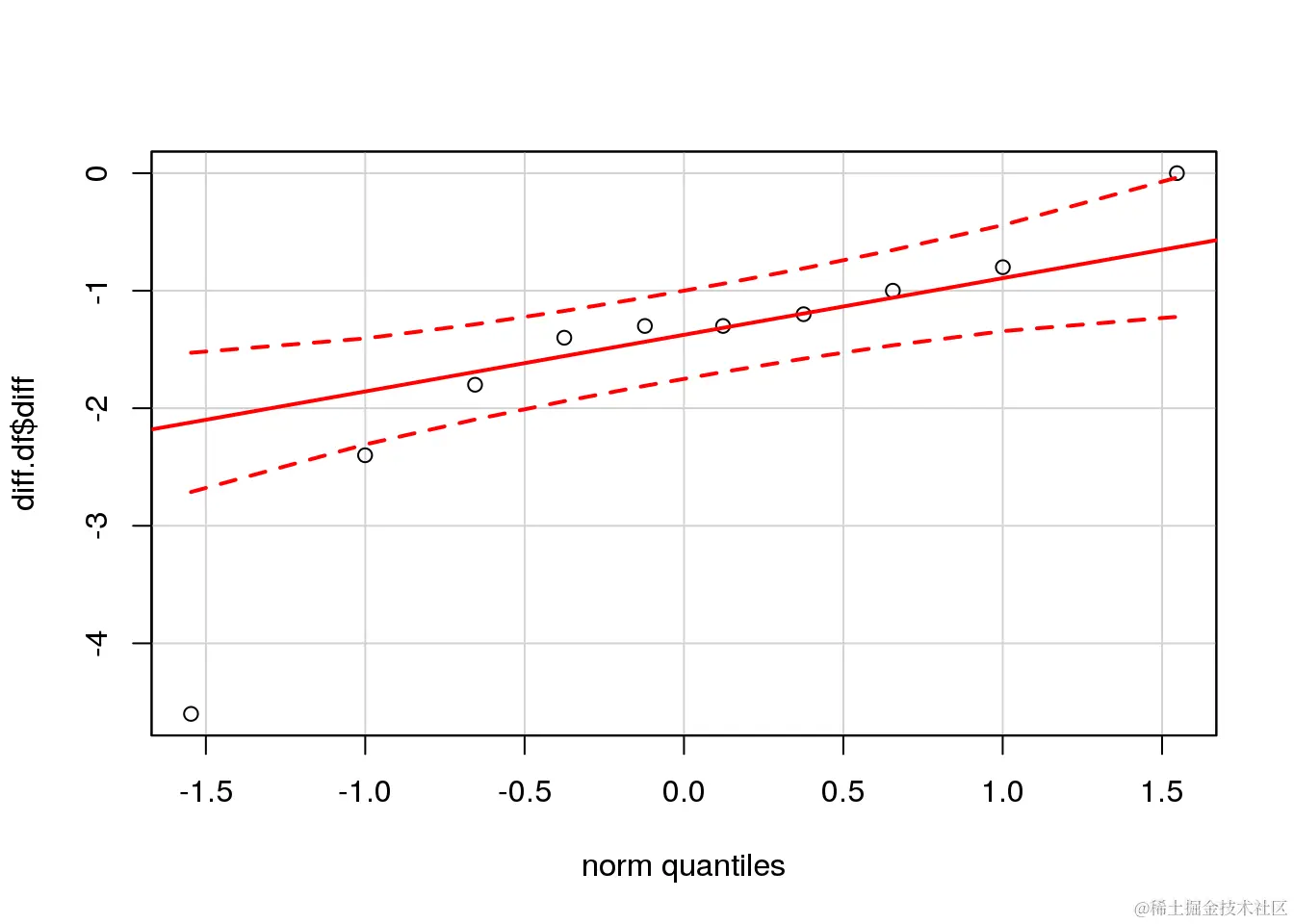 QQ图显示,除了重尾之外,差异相当符合正态模型。由此,我们可以得出结论,t检验的假设得到了充分的满足。不过,我们还是对t检验是否是这些数据最合适的选择感到不确定。