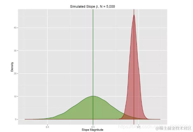 不省略,则模拟产生绿色采样分布,以真实值为中心。所有模拟的平均值为0.4998。当