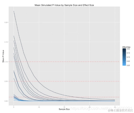 其次,这个图说明了一个关于p值的常见警告:总是在样本大小的范围内解释它们。缺乏统计意义并不意味着缺乏效果。可能存在效果,但样本大小可能不足以检测它(或者数据集中的可变性太高)。另一方面,仅仅因为p值表示统计显着性并不意味着该效果实际上是有意义的。考虑效果大小.00000001(实际为0)。根据该图表,随着样本大小的增加,甚至该效应大小的p值趋于0,最终超过统计显着性阈值。