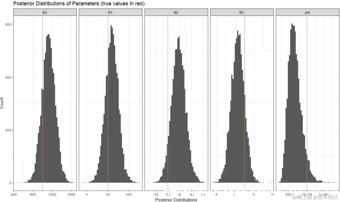 这将产生1,000组后验均值和1,000组95%置信区间。平均而言,这1000个后验均值应以真实值为中心。平均而言,真实参数值应在95%的时间的置信区间内。