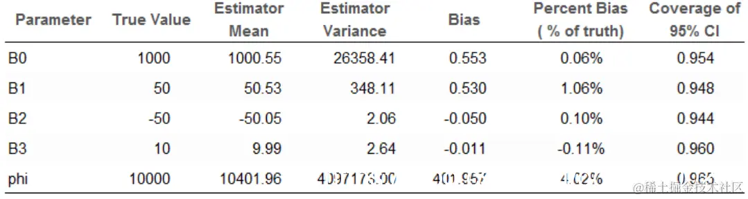 “估计平均值”列是所有1,000个模拟中的平均后验平均值。偏差百分比均小于5%。对于所有参数,95%CI的覆盖率约为95%。