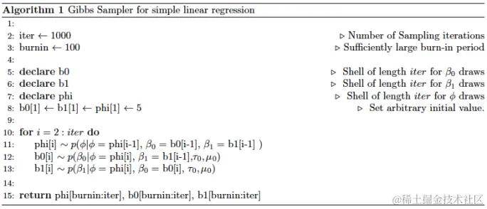 要从这种后验分布中得出,我们可以使用Gibbs采样算法。吉布斯采样是一种迭代算法,从每个感兴趣的参数的后验分布生成样本。它通过以下方式从每个参数的条件后验分布依次得出的: