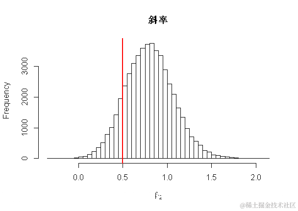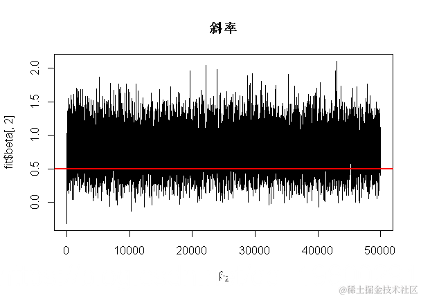 hist(fit$beta[,2],main="Slope",xlab=expression(beta[2]),breaks=50)