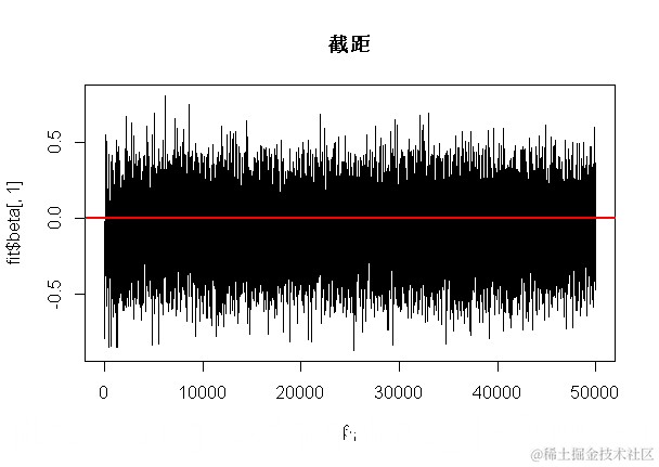 hist(fit$beta[,1],main="Intercept",xlab=expression(beta[1]),breaks=50)