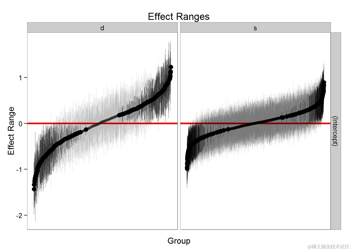 在下一个选项卡上,固定效应和组级效果的分布在置信区间图上显示。这些对于诊断非常有用,并提供了检查各种参数的相对大小的方法。