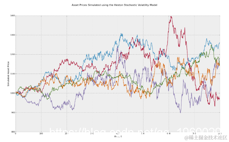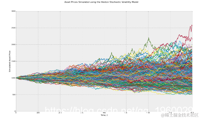 使用Heston随机波动率几何布朗运动随机过程模拟资产价格。