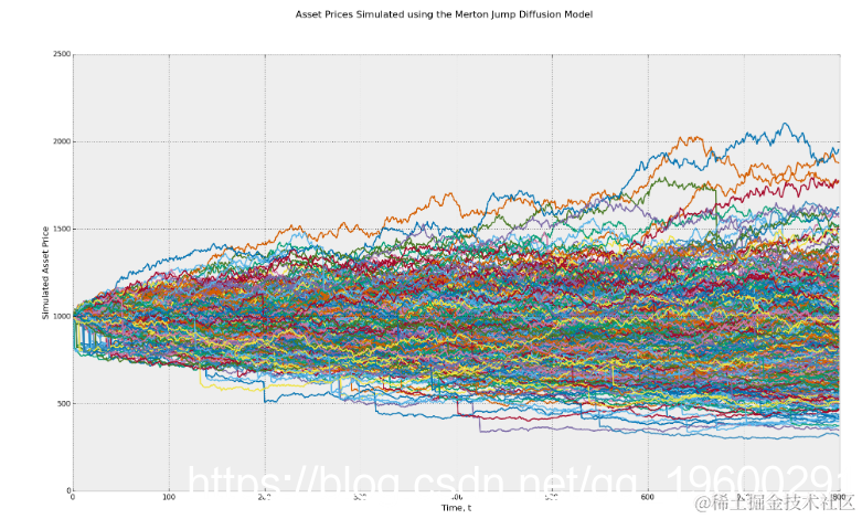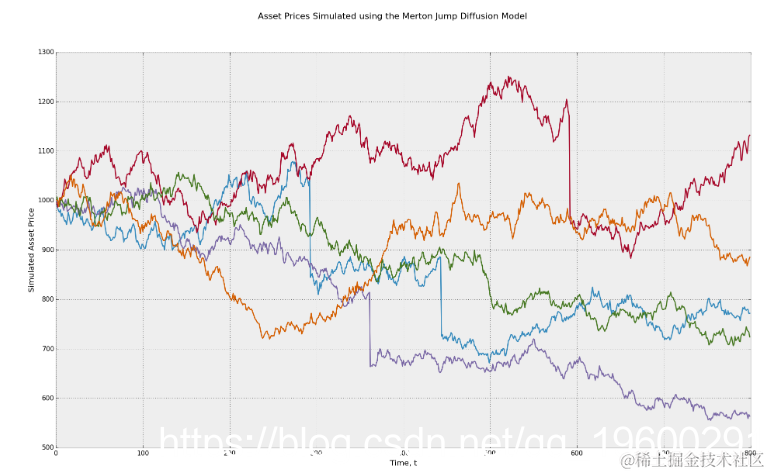 使用默顿跳跃扩散几何布朗运动随机过程模拟资产价格。