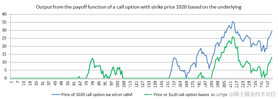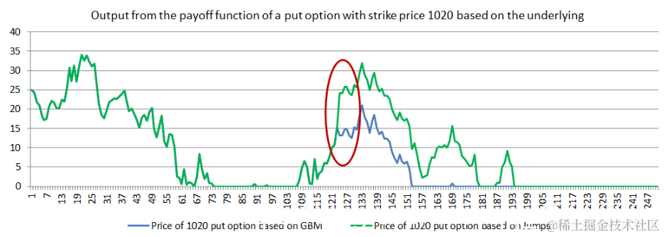 想要这样做的原因如下图所示。事实上,你如何选择和校准你的随机过程将对期权的预期收益产生重大影响。