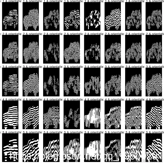 其中gaborFeatures是提取的特征,其行数等于nrow(im)x ncol(im)(或166 x 249),列数等于scale x orientationations(或5 x 8)。第二和第三个子列表是与gabor滤波器卷积后得到的图像的虚部和实部。以下代码块允许用户绘制图像的不同比例和方向,