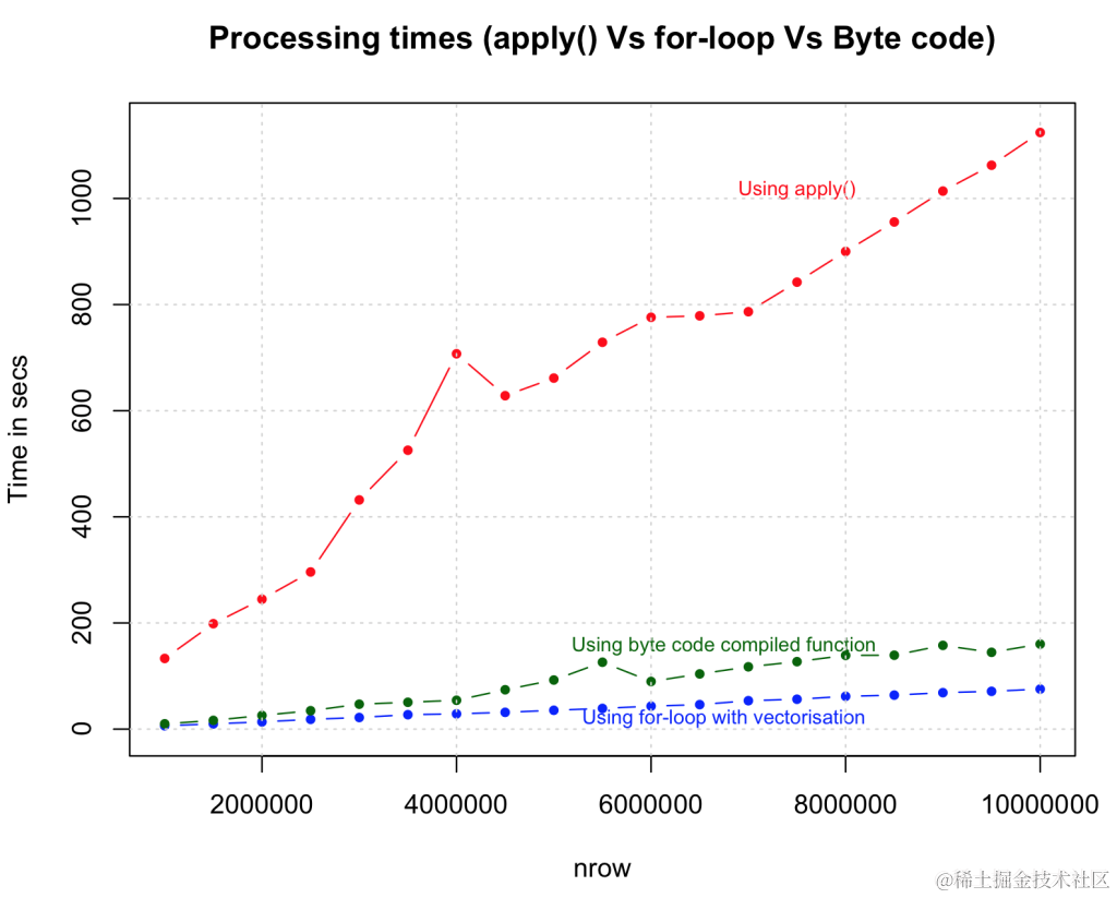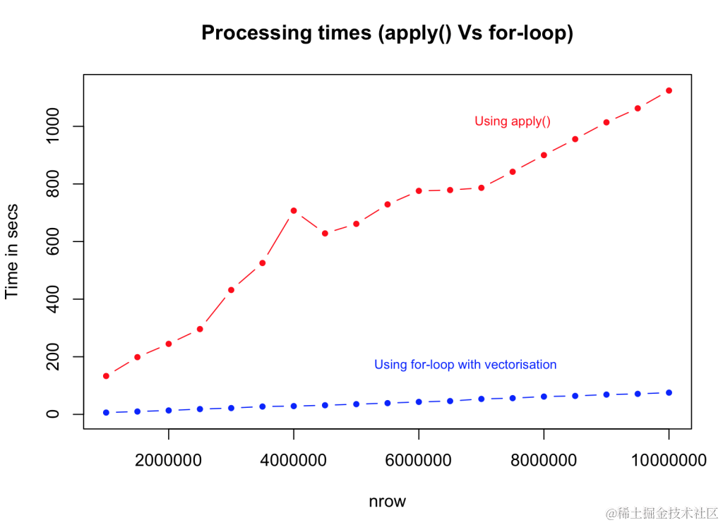 使用apply()函数计算相同的逻辑并将其与矢量化的for循环进行比较。结果再次以大小的顺序更快但比ifelse()在循环外进行条件检查的版本慢。这可能非常有用,但在处理复杂逻辑时您需要有点狡猾。