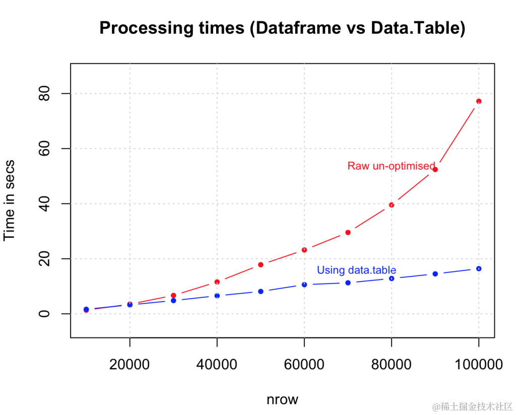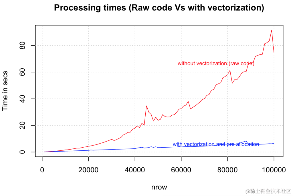 始终将数据结构和输出变量初始化为所需的长度和数据类型,然后再将其循环进行计算。尽量不要逐渐增加循环内数据的大小。让我们比较一下矢量化如何在1000到100,000行的数据大小范围内提高速度。
