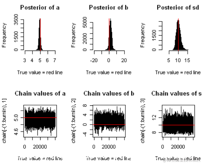 图: 上排显示斜率(a)的后验估计,截距(b)和误差的标准偏差(sd)。下一行显示马尔可夫链参数值。