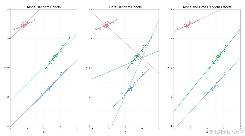 结果如下所示。 每组只有一个单独的线性回归。对于蓝色和红色组,线条在大多数情况下非常适合数据,但对于只有三个数据点的绿色组,线条遍布整个地方,因为没有任何先验信息,估计数据的斜率和偏移量非常不确定。右侧的图表显示 因为该模型假设所有三组的斜率和偏移都是从一个分布中得出的,所以可以合理地假设斜率是正的。我们知道这适用于这个例子,因为我们设计了数据生成过程。
