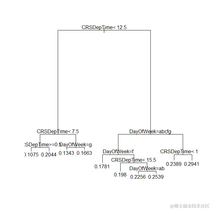 作为大型数据分类树的示例,请使用完整航空公司数据的7%子样本考虑以下简单模型(使用变量ArrDel15表示到达延迟为15分钟或更长时间的航班):