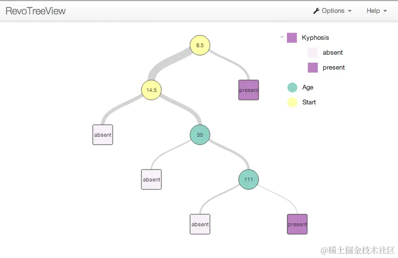 kyphTree rxDTree(公式=脊柱后凸〜年龄+开始+数字,数据=脊柱后凸, cp = 0.01) 数据:脊柱后凸 有效观察数:81 缺失观察数:0 树表示: n = 81 node),split,n,loss,yval,(yprob) *表示终端节点 1)根81 17缺席(0.79012346 0.20987654) 2)开始> = 8.5 62 6缺席(0.90322581 0.09677419) 4)开始> = 14.5 29 0缺席(1.00000000 0.00000000)* 5)开始<14.5 33 6缺席(0.81818182 0.18181818) 10)年龄<55 12 0缺席(1.00000000 0.00000000)* 11)年龄> = 55 21 6缺席(0.71428571 0.28571429) 22)年龄> = 111 14 2缺席(0.85714286 0.14285714)* 23)年龄<111 7 3(0.42857143 0.57142857)* 3)开始<8.5 19 8现在(0.42105263 0.57894737)*
