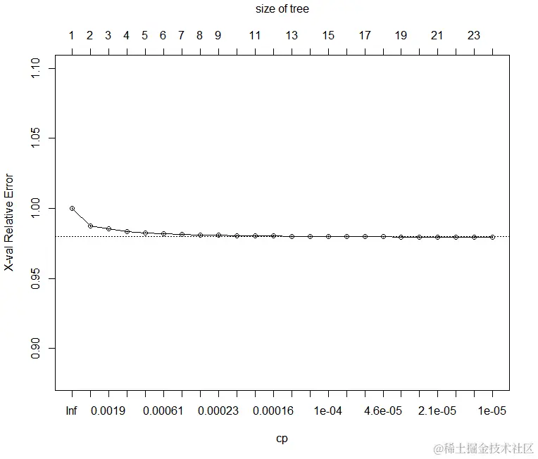 对于符合2倍或更高交叉验证的模型,使用交叉验证标准错误(cptable组件的一部分)作为修剪指南很有用.rpart函数plotcp对此有用: