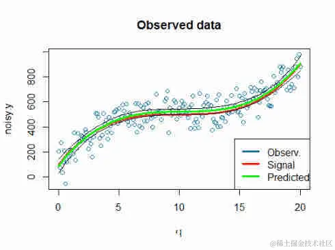 这是我们模拟观测数据的图。模拟的数据点是蓝色的点,而红色的线是信号(信号是一个技术术语,通常用于表示我们感兴趣检测的总体趋势)。