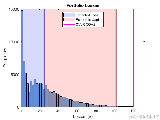 plotline = @(x,color)plot([xx],ylim,'LineWidth',2,'Color',color); cvarline = plotline(pr.CVaR,'m'); %遮蔽预期损失和经济资本的领域。 plotband = @(x,color)patch([x fliplr(x)],[0 0 repmat(max(ylim),1,2)],... color,'FaceAlpha',0.15); elband = plotband([0 pr.EL],'blue'); ulband = plotband([pr.EL pr.VaR],'red');
