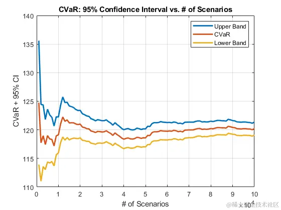 cb = confidenceBands(cc); %置信带存储在表格中。 CB(1:5,:) ans = 5x4表 NumScenarios降低CVaR上限 ____________ ______ ______ ______ 1000 113.92 124.76 135.59 2000 111.02 117.74 124.45 3000 113.58 118.97 124.36 4000 113.06 117.44 121.81 5000 114.38 118.99 123.6