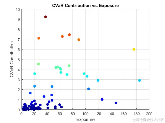 pointSize = 50; colorVector = rc_sorted.CVaR; scatter(cc.Portfolio(idx,:)。EAD,rc_sorted.CVaR,... pointSize,colorVector,'filled') colormap('jet')