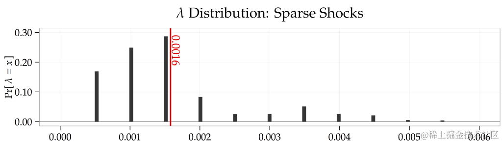 惩罚参数选择。使LASSO拟合数据涉及选择惩罚参数。我这样做是通过选择在数据的第一个时段期间具有最高样本外预测的惩罚参数。这就是为什么上面的预测回归仅使用从而不是使用数据开始的原因。下图显示了模拟中惩罚参数选择的分布。