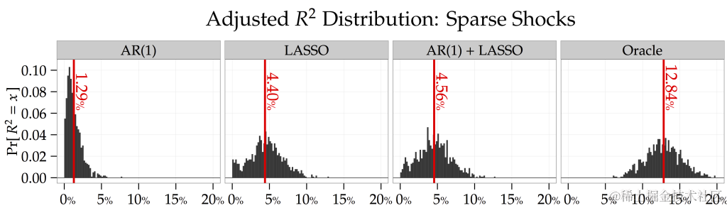 下图显示,在这两种情况下,LASSO都不会增加任何预测能力。因此,运行这些模拟提供了一对不错的测试,显示LASSO确实在返回的横截面中拾取稀疏信号。