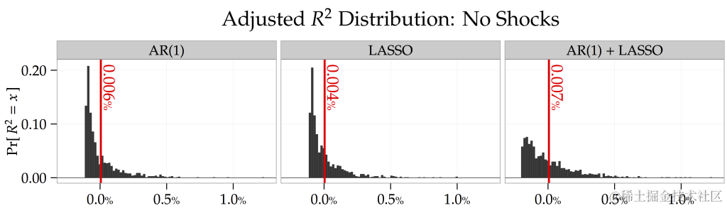 测试。我通过研究两个替代模拟来结束这篇文章,其中LASSO不应该增加任何预测能力。也就是说,使用下面的模型模拟股票的收益,