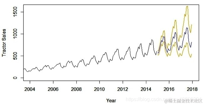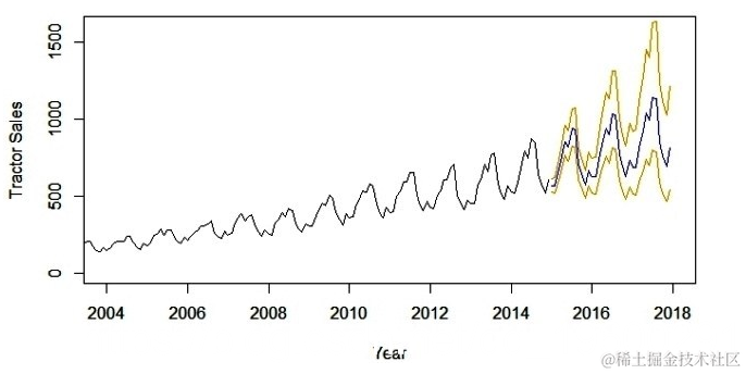 以下是拖拉机销售预测值为蓝色的输出。此外,预测误差的范围(即标准偏差的2倍)在预测蓝线的两侧显示橙色线。