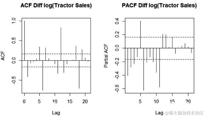 以下是与输出图相同的R代码。请注意,由于我们在没有差分的情况下使用原始数据,因此该系列不是平均值。