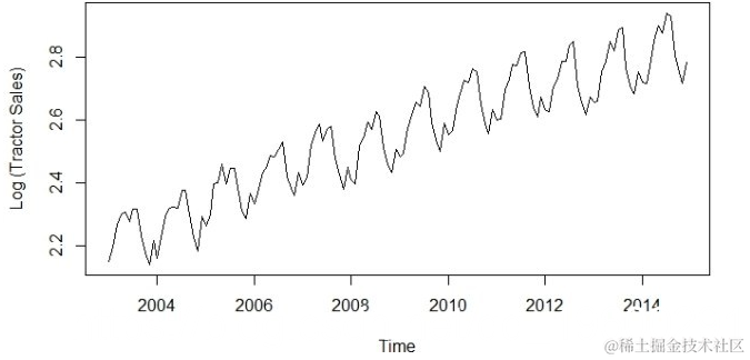 plot(log10(data),ylab='Log (Tractor Sales)')