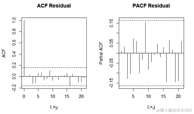 由于ACF和PACF图的无效区域之外没有尖峰,我们可以得出结论,残差是随机的。