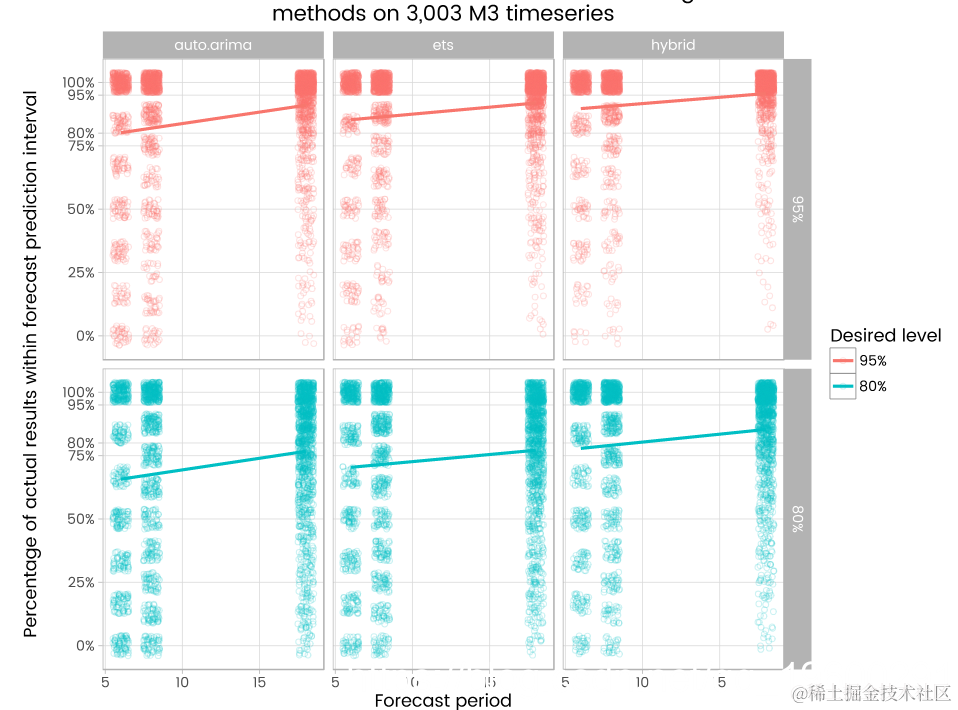 混合方法有接近预期的成功率,而这两个预测区间ets()和auto.arima()不太成功。