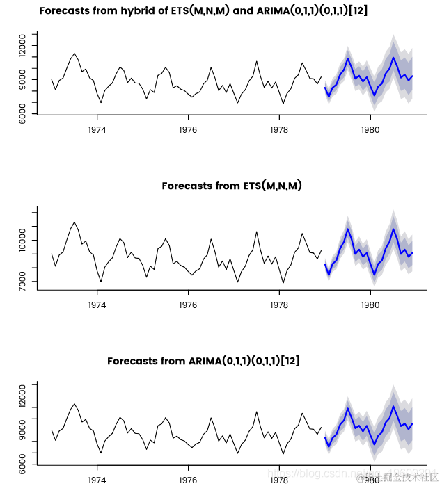 我结合auto.arima()并ets(),有效地进行混合预测。为了更方便,我创建了一个混合预测并生成forecast类对象的函数。