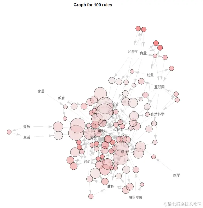 library(readr)library(arules)library(arulesViz)library(dplyr)topic_info <- read_csv("E:/data/data/zhihu_topics.csv")Encoding(topic_info$topic) <- "gbk"user_topic_sample <- read_csv("E:/data/data/zhihu_user_topic_sample.csv")user_topic_sample <- user_topic_sample="">% left_join(topic_info[,1:2])trans <- as(split(user_topic_sample$topic,user_topic_sample$user_token),"transactions")rules <- apriori(trans,parameter = list(supp=0.1,conf=0.5,minlen=2))summary(rules)rules.sorted <- by="lift">% head(50) lhs rhs support confidence lift count[1] {旅行,美食,心理学} => {时尚} 0.1015915 0.7318048 3.065149 3479[2] {健身,美食} => {时尚} 0.1031099 0.6927604 2.901612 3531[3] {电影,旅行,心理学} => {时尚} 0.1069937 0.6879459 2.881447 3664[4] {美食,心理学} => {家居} 0.1003066 0.5069362 2.868005 3435[5] {电影,旅行,美食} => {时尚} 0.1104687 0.6830986 2.861144 3783[6] {电影,美食,心理学} => {时尚} 0.1116659 0.6745458 2.825320 3824[7] {健身,心理学} => {时尚} 0.1055921 0.6569767 2.751733 3616[8] {家居} => {时尚} 0.1146153 0.6484388 2.715972 3925[9] {旅行,心理学} => {时尚} 0.1209228 0.6474359 2.711771 4141[10] {健身,旅行} => {时尚} 0.1037232 0.6473483 2.711404 3552[11] {旅行,美食} => {时尚} 0.1232005 0.6455018 2.703671 4219[12] {电影,旅行,时尚} => {美食} 0.1104687 0.8419764 2.689440 3783[13] {旅行,时尚,心理学} => {美食} 0.1015915 0.8401352 2.683559 3479[14] {商业} => {创业} 0.1386772 0.6043523 2.653679 4749[15] {创业} => {商业} 0.1386772 0.6089242 2.653679 4749[16] {美食,心理学} => {时尚} 0.1250986 0.6322314 2.648088 4284[17] {美食,设计} => {时尚} 0.1017667 0.6320276 2.647234 3485[18] {电影,健身,美食} => {旅行} 0.1030223 0.8275862 2.635608 3528[19] {电影,家居} => {美食} 0.1067601 0.8175313 2.611357 3656[20] {电影,生活} => {音乐} 0.1106731 0.6273796 2.605143 3790[21] {设计,心理学} => {时尚} 0.1066433 0.6206662 2.599647 3652[22] {旅行,心理学} => {教育} 0.1022631 0.5475297 2.595536 3502[23] {电影,时尚,心理学} => {美食} 0.1116659 0.8118896 2.593336 3824[24] {美食,时尚,心理学} => {旅行} 0.1015915 0.8120915 2.586262 3479[25] {电影,美食,时尚} => {旅行} 0.1104687 0.8102377 2.580358 3783[26] {电影,旅行,心理学} => {美食} 0.1241349 0.7981600 2.549481 4251[27] {家居,心理学} => {美食} 0.1003066 0.7958758 2.542185 3435[28] {经济学} => {商业} 0.1366915 0.5831568 2.541385 4681[29] {商业} => {经济学} 0.1366915 0.5956987 2.541385 4681[30] {旅行,心理学} => {职业发展} 0.1016791 0.5444028 2.538890 3482[31] {旅行,时尚} => {美食} 0.1232005 0.7948380 2.538870 4219[32] {电影,健身,心理学} => {美食} 0.1009490 0.7898104 2.522811 3457[33] {美食,心理学} => {教育} 0.1051248 0.5312869 2.518538 3600[34] {电影,商业} => {互联网} 0.1016207 0.6815511 2.518041 3480[35] {创业,电影} => {互联网} 0.1006862 0.6791412 2.509137 3448[36] {电影,健身,心理学} => {旅行} 0.1004818 0.7861549 2.503662 3441[37] {电影,健身,旅行} => {美食} 0.1030223 0.7826087 2.499807 3528[38] {健康} => {生活} 0.1190539 0.6937213 2.498579 4077[39] {电影,设计,心理学} => {美食} 0.1091254 0.7806559 2.493570 3737[40] {教育} => {职业发展} 0.1122500 0.5321152 2.481586 3844[41] {职业发展} => {教育} 0.1122500 0.5234918 2.481586 3844[42] {电影,时尚,心理学} => {旅行} 0.1069937 0.7779193 2.477434 3664[43] {健身,美食} => {旅行} 0.1156373 0.7769276 2.474276 3960[44] {美食,心理学} => {职业发展} 0.1046576 0.5289256 2.466711 3584[45] {电影,健身} => {时尚} 0.1102351 0.5883728 2.464387 3775[46] {电影,互联网} => {商业} 0.1016207 0.5648434 2.461576 3480[47] {设计,时尚} => {美食} 0.1017667 0.7699956 2.459519 3485[48] {健身,时尚} => {旅行} 0.1037232 0.7721739 2.459137 3552[49] {电影,互联网} => {创业} 0.1006862 0.5596494 2.457391 3448[50] {美食,时尚} => {旅行} 0.1232005 0.7705936 2.454104 4219