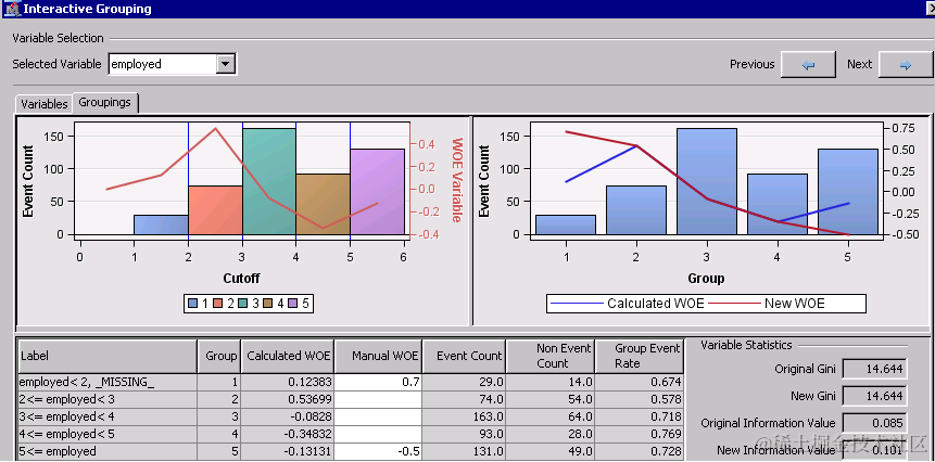 对于某些变量输入,您可能需要手动调整证据权重(WOE)。例如,可变采用总结了信用申请人在当前工作中受雇的年数。一般而言,当前工作的年数往往与信用违约成反比。对于该数据集,证据权重不会因第1组至第5组单调减少这一事实可能是由于多种原因。例如,这个数据集可能是样本偏向的,因为许多使用<2的应用程序是手动选择或“挑选”,并且它们的良好行为反映在低事件数和低权重证据中。要防止此样本偏差影响您的记分卡,您可以使用交互式应用程序中“分组”选项卡的“粗略详细信息”视图上的“手动WOE”列。对于组1,将WOE从0.1283更改为0.7,对于组2,将WOE从-0.13131更改为-0.5。新的WOE和信息值被重新计算为新信息值。