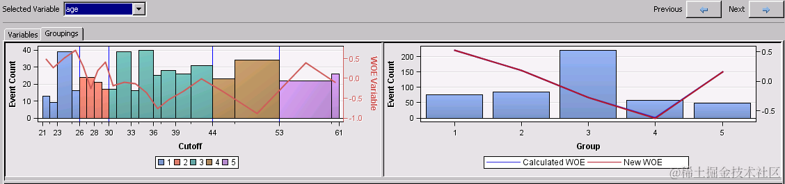 在幕后运行的过程可以根据您可以轻松定制的某些约束找到相对于目标的输入的最佳分级。确保使用节点的交互式应用程序直观地确认事件计数和证据权重趋势对您的分箱有意义。如有必要,您可以合并箱,创建新组或手动调整证据权重。