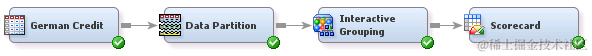 建立记分卡用于构建信用记分卡的基本流程图中的节点包括:输入数据源,数据分区,交互式分组和记分卡。在本例中,您可以使用SAS Enterprise Miner的“帮助”菜单中提供的德语信用数据集。单击Help-> Generate Sample Data Source - > German Credit。该数据集具有二元目标good_bad,其指示客户是否默认其每月付款(指定为值'BAD'),以及与作为输入或特征的人口统计和信用局相关的若干其他变量。