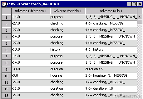 当您指定记分卡属性生成报告=是以输出不良特征时,您的结果还将包括每个观察结果降低得分最多的变量。您最多可以选择5种不利特征。作为如何解释此列的示例,对于下面数据集的第一次观察,扣除了14个得分点,因为贷款的目的标记为1,3,8,缺失或未知。