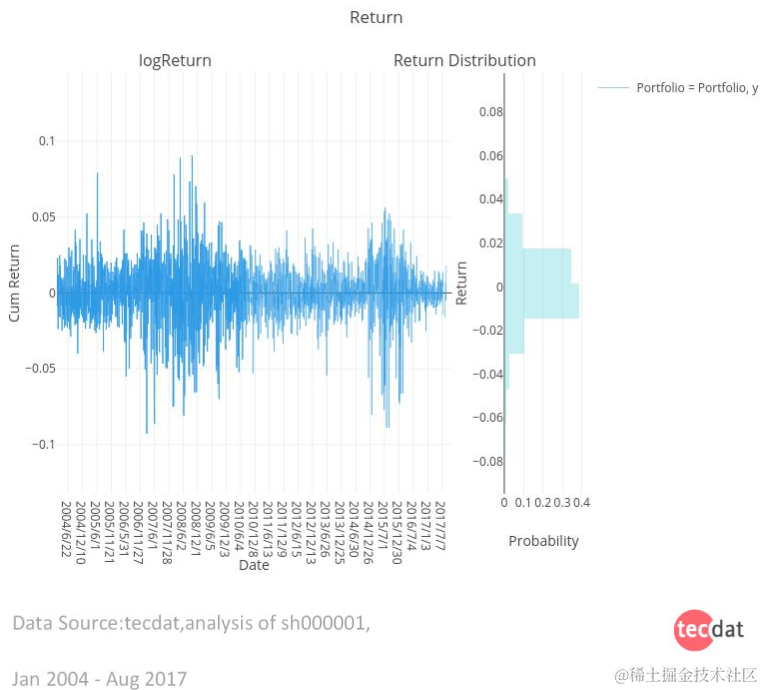 绘制上证指数的收盘价和收益率数据,我们看到2004年和2017年期间股市的波动情况。