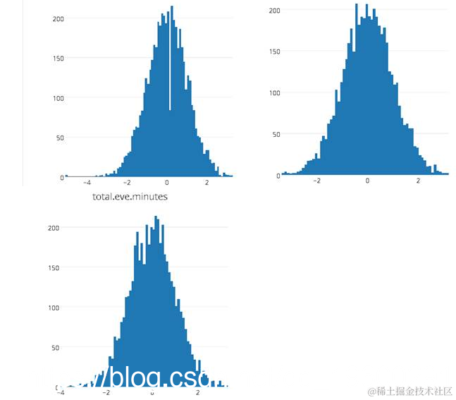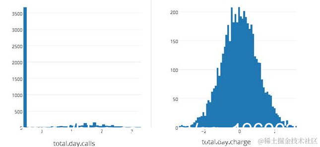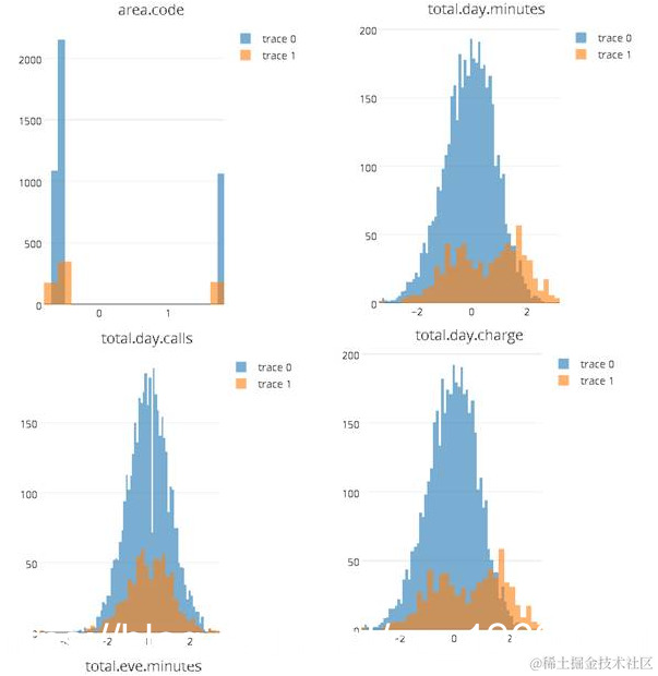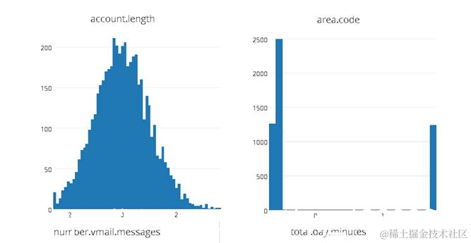从上面的结果中,我们可以看到除了emailcode和areacode之外,其他数值变量近似符合正态分布。