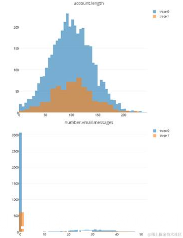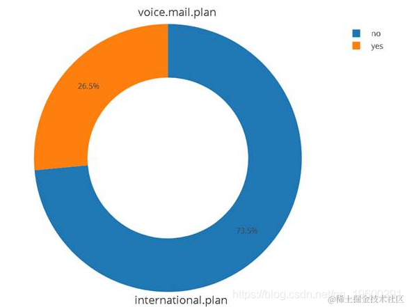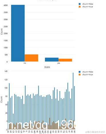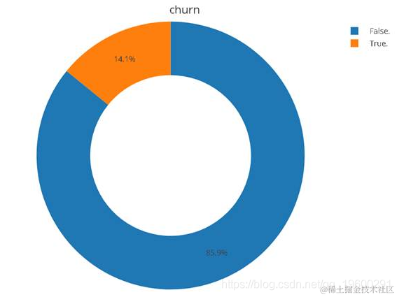 从上面的结果中,我们可以看到churn为no的样本数目要远远大于churn为yes的样本,因此所有样本中churn占多数。