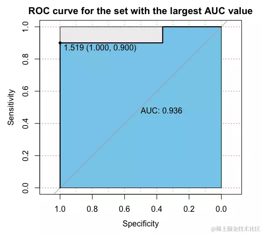 2、选取最优训练集与测试集。构建for循环,得到十次交叉验证预测的AUC值。并纪录取值最大的一组,作为最优的训练集与测试集划分。