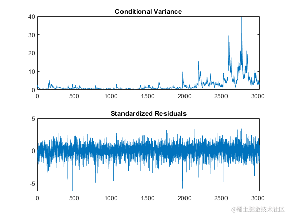 估计显示五个估计参数及其对应的标准误差(AR(1),条件均值模型具有两个参数,GARCH(1,1)条件方差模型具有三个参数。